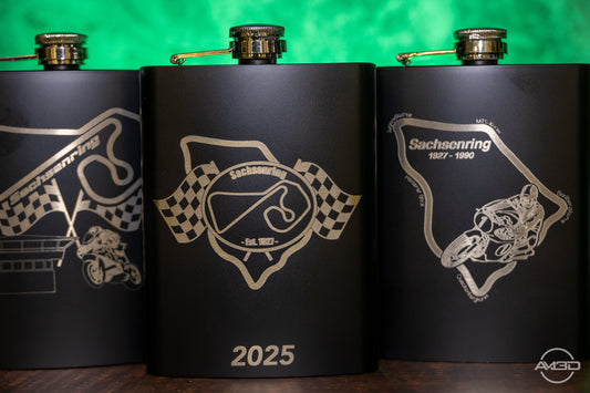 Sachsenring Flachmann 2025 – Edelstahl matt schwarz mit Lasergravur | 8 oz | Einzelstück oder im 3er-Set erhältlich