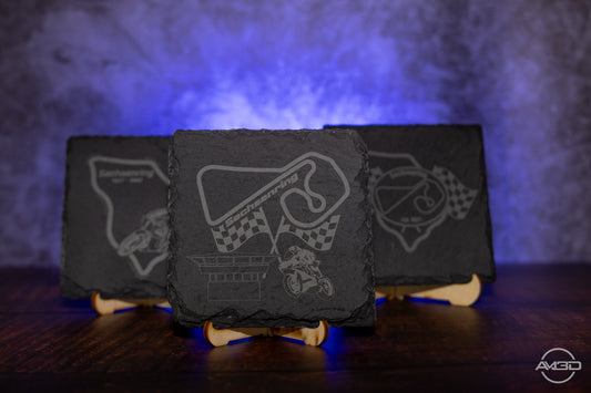 Sachsenring Untersetzer aus Schiefer 10x10 cm – Lasergraviert mit rutschfesten Füßen – Geschenk für Motorsport- und Motorradfans